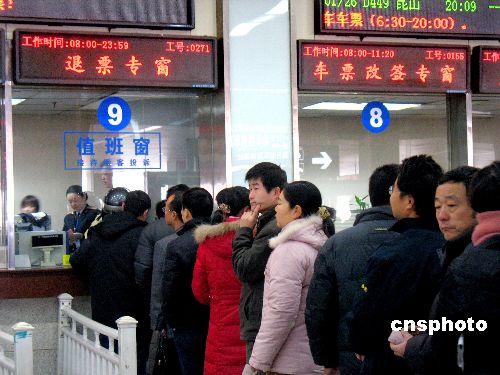 2009年1月23日,鐵路南京站售票大廳的退票窗口前排起長隊。據了解,這種狀況已持續一段時間。火車票一票難求的狀況下尤為引人注目,據稱多為多渠道重復購票所致。中新社發 王路憲 攝