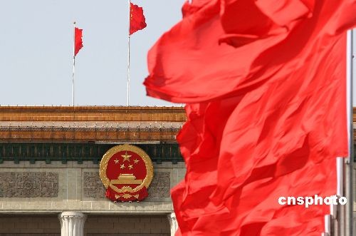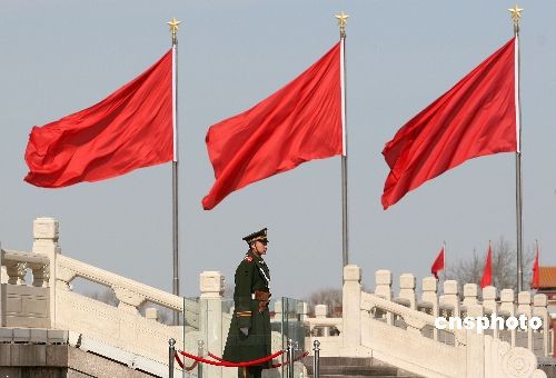 2009年3月1日,“兩會”即將召開,北京天安門廣場及周邊建筑掛起了紅旗,廣場上一片喜慶祥和氣氛。中新社發 魯谷 攝