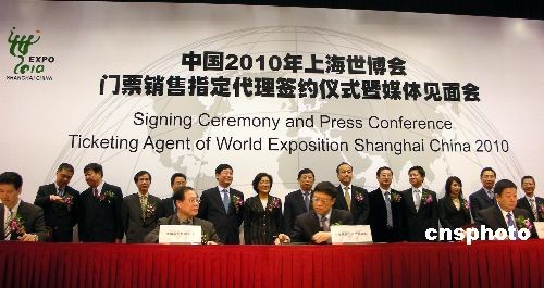 3月2日,中國移動、交通銀行、香港中國旅行社、臺灣中國旅行社、日本JTB公司等首批上海世博會境內外門票銷售指定代理商與上海世博局簽約,此舉標志著上海世博會門票銷售工作正式啟動。3月27日起,上述機構開始正式受理團體購票。 中新社發 張帆 攝