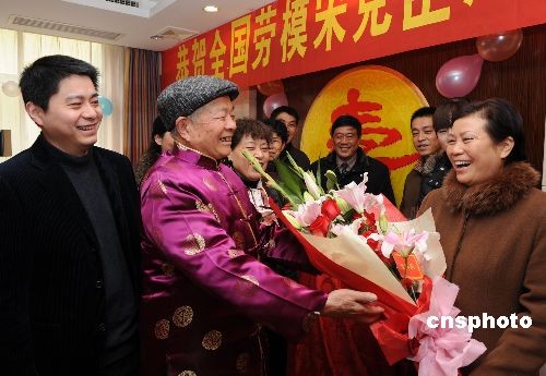3月13日,安徽六安市為全國勞動模范宋克臣祝賀80壽辰。宋克臣1948年參加革命,1958年,他發(fā)明轟動全國的自動售糧器;2008年汶川地震發(fā)生后,他把自己發(fā)明的《高層建筑應急逃生裝置》專利無償捐獻給國家。60年來,宋克臣通過刻苦自學,共發(fā)明創(chuàng)造45項各類實用技術,成為遠近聞名的勞模發(fā)明家。中新社發(fā) 陳超平 攝