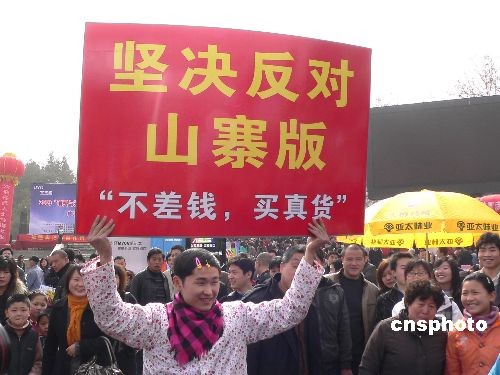 3月15日,在鄭州紫荊山廣場3·15活動現(xiàn)場,“山寨版”小沈陽將“堅(jiān)決反對山寨版”的牌子高高舉起,倡導(dǎo)民眾買真貨。中新社發(fā) 王中舉 攝