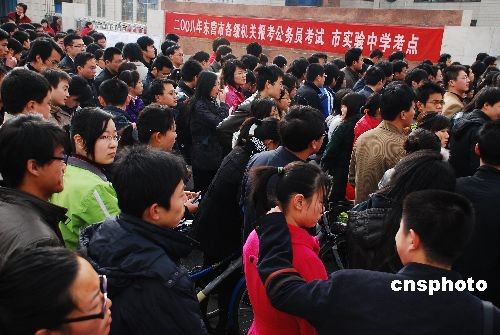 3月15日,參加山東公務(wù)員考試的考生們在山東東營市實驗中學(xué)考點等待進入考場。當日,2009年度山東公務(wù)員考試公共科目筆試在全省同時舉行,共有39萬多人參加考試,競爭8685個崗位。中新社發(fā) 李波 攝