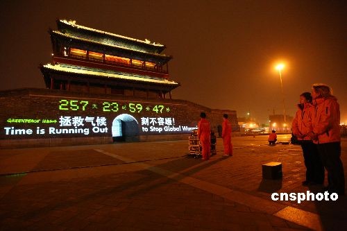 3月23日,在世界氣象日當天,國際環保組織綠色和平在北京永定門城樓啟動拯救氣候倒計時活動,希望藉此傳達世界變暖已經迫在眉睫的危機感。2009年12月,聯合國氣候變化會議將在丹麥首都哥本哈根舉行,屆時各國領導人將就未來應對氣候變化的全球行動簽署協議。這將是繼2005年生效的《京都議定書》后又一具有劃時代意義的全球氣候協議書,將對地球未來的氣候變化產生重要影響。中新社發 富田 攝