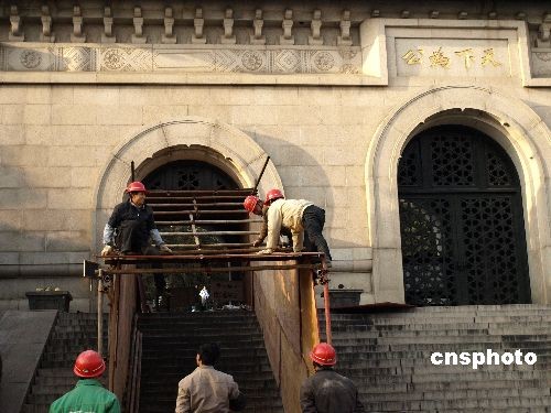 據南京市中山陵園管理局消息,為迎接孫中山奉安大典80周年,南京市近日投資300多萬元啟動中山陵主體建筑維修工程。據了解,這也是自新中國成立近60年來,中山陵第二次大規模維修,上次規模較大的維修是在1982年。“吾死之后,可葬于紫金山麓,因南京為臨時政府所在地,所以不忘辛亥革命也。”遵照孫中山先生的遺愿,中山陵于1926年春開始修建,至1929年建成,當年6月1日,中山先生的靈柩奉安于此。 中新社發 楊潔 攝