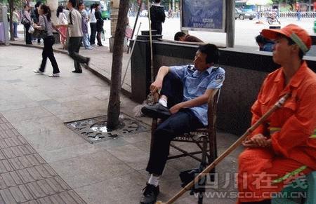 昨日(5日),照片里的主角,宜賓市(四川)翠屏區市容管理局南城中隊協管員李劍勇表示,單位領導已批評教育他了,自己影響了宜賓和宜賓城管的形象,他表示非常抱歉。“當時所有的攤點都已規范位置了,想坐著休息下。”李劍勇說,城管協管員沒有固定工作點,他便在游攤最易出現的南門橋頭坐著休息會兒,他希望所有的城管隊員都將他作為反面教材,在以后的工作中注意紀律和形象。