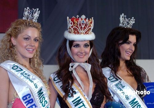 10月15日晚上,2007年國際小姐選美大賽決賽在日本東京舉行,六十一位佳麗參加角逐。經(jīng)過民族服裝、泳裝和晚禮服等項目激烈的競爭,最終2007年國際小姐由墨西哥小姐Priscilla Perales獲得,亞軍由希臘小姐Despoina Vlepaki獲得,而季軍則由白俄羅斯小姐Yuliya Iindzeyeva摘取。來自中國香港的香港小姐王君馨獲得2007國際友誼小姐的獎項。中新社發(fā) 滕劍峰 攝