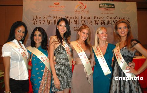 圖為安哥拉小姐、印度小姐、中國小姐、南非小姐、美國小姐、立陶宛小姐(從左至右)在新聞發(fā)布會上亮相。