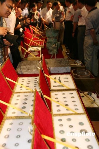 7月14日上午,河南省文物局和安陽市在河南博物院多功能廳舉行河南省征調文物入藏儀式,將河南博物院和河南省文物考古研究所收藏的193件有關文字的文物移交中國文字博物館收藏。這批移交的文物包括河南博物院藏“十六年鄭令”戈、銅“部曲將”印、曾子甗等123件文物和河南省文物考古研究所藏的賈湖龜腹甲刻符、新蔡葛陵楚墓竹簡、溫縣盟書、長子口鼎、、薳子昃鼎、平夜君成戈、垂球等不同歷史時期的各門類文物70件。中新社發 王中舉 攝