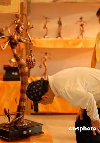 云南民族民間工藝品交易市場6月10日在昆明開業(yè),該市場占地10000平方米,是中國少有的民族民間工藝品專業(yè)交易場所。云南省將借助該市場推出木雕、青銅器、錫器等具有競爭力的民族民間工藝品,做大民族文化產(chǎn)業(yè)。開業(yè)僅兩天,該市場已成為云南各大旅行社帶團(tuán)參觀的必經(jīng)之地。圖為6月13日,一名游客被一尊名為汲水歸來的銅像吸引,該銅像獨具傣家風(fēng)情,叫價近萬元。中新社發(fā) 保旭 攝