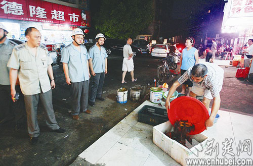 大排檔擠占道路,蝦殼毛豆殼等狼籍遍地,既妨礙交通更影響市容。前晚,武漢市城管局在七城區(qū)同時(shí)展開(kāi)專(zhuān)項(xiàng)整治,要求每區(qū)出動(dòng)50名執(zhí)法人員,只能采取宣傳、勸說(shuō)等方式治理占道經(jīng)營(yíng)。