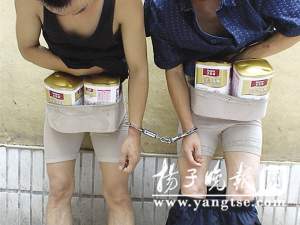 14日下午3點(diǎn)半左右,兩名男子在南京建寧路一家超市里偷了4聽奶粉藏在內(nèi)褲里準(zhǔn)備偷運(yùn)出超市。在超市門口被保安發(fā)現(xiàn)后,兩人四處逃竄,其中一人跑到奶粉貨架處,脫了褲子就把奶粉放回貨架上,但還是被保安和熱心的市民抓住。令人啼笑皆非的是,偷奶粉的兩名男子竟然各穿了三條女性緊身內(nèi)褲方便作案。