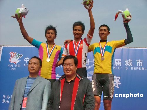 十月二十日上午,第六屆全國城市運動會自行車男子公路決賽在河南洛陽新區體育中心舉行,經過激烈的爭奪,河南平頂山市小伙仇光遠摘得貴冠,昆明的陳武、銀川的征學東分別獲得第二、第三名。 圖為獲獎選手與頒獎人員合影留念。中新社發 史寶銀 攝