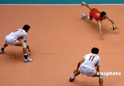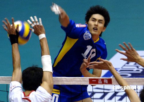 10月20日,在江蘇省淮安市舉行的2007-2008年安踏全國排球聯賽上,江蘇男排1:3不敵上海男排。中新社發 曹政 攝