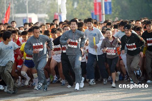 十月二十一日,2007年全日空北京國際馬拉松賽在北京國家奧林匹克體育中心鳴槍開跑,陸毅、馬伊俐等影視演員以及北京國安足球隊(duì)隊(duì)員徐云龍等參加了馬拉松比賽。中新社發(fā) 盛佳鵬 攝