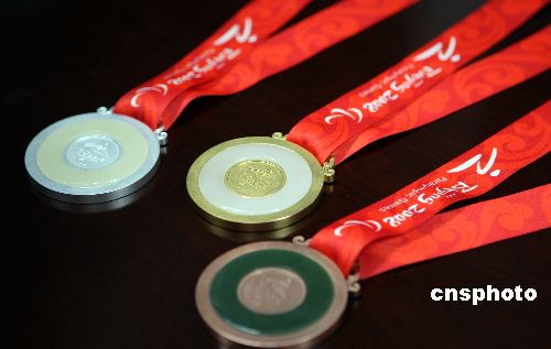 十一月十四日,北京奧組委發布2008年殘奧會獎牌式樣,其設計創意、造型與北京奧運會獎牌一脈相承,體現了“兩個奧運 同樣精彩”的要求。殘奧會獎牌正面鑲玉的設計靈感來自中國古代的玉器造型,中間為北京2008年殘奧會會徽;玉的色澤隨金、銀、銅牌有所變化,分別為白玉、青白玉、青玉。中新社發 任海霞 攝