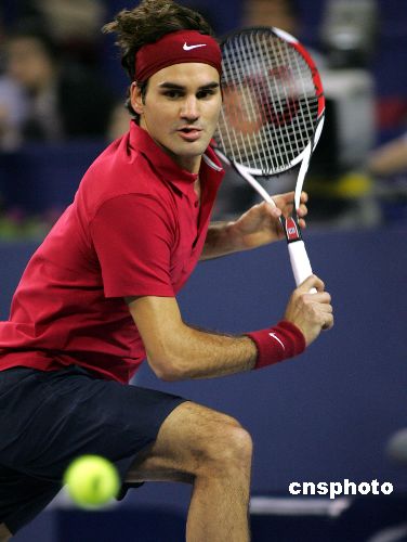 11月16日,在2007年上海大師杯單打紅組最后一輪比賽中,費德勒以6-4/6-2擊敗羅迪克,以小組第一挺進四強,費德勒在半決賽中將對陣納達爾。中新社發 湯彥俊 攝