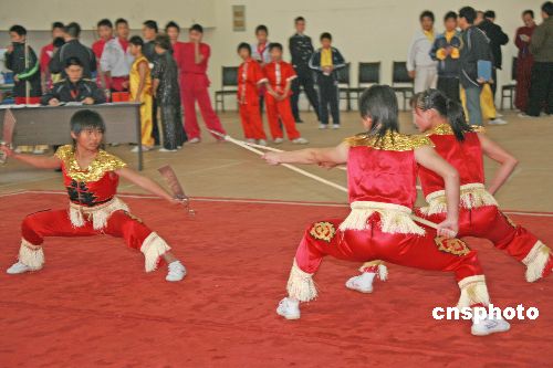 2007年11月19日,為期3天的“2007中國安徽首屆傳統(tǒng)武術大會暨武術套路國際邀請賽”在安徽省黃山市舉行。本次比賽分為傳統(tǒng)武術和武術套路兩個部分,其中有個人單項、個人全能比賽;有傳統(tǒng)拳術、傳統(tǒng)器械、對練3個項目。來自中國、美國、澳大利亞、波蘭、日本、新加坡、加蓬、越南、菲律賓、古巴和中國香港等十多個國家和地區(qū),共有43支代表隊的439名運動員參加比賽。中新社發(fā) 方也廣德 攝