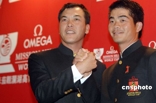 中國著名球手張連偉/梁文沖十一月二十一日在觀瀾湖東莞會所出席媒體見面會,代表中國隊征戰二〇〇七歐米茄觀瀾湖高爾夫世界杯。張連偉表示:我們這次在國內參加高爾夫世界杯感到很溫暖。中新社發 陳文 攝