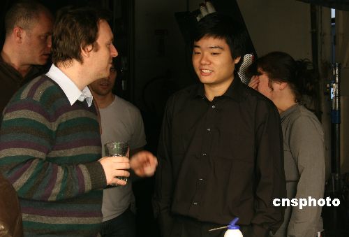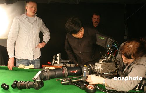 圖為拍攝準(zhǔn)備時,丁俊暉(中)在“研究”攝像機。
