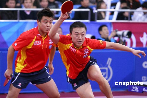 12月15日,2007年度國際乒聯職業巡回賽總決賽在北京大學體育館進入第三個賽日的爭奪。在當日下午進行的一場男雙半決賽中,郝帥/馬龍和王皓/馬琳狹路相逢,經過7局苦戰,王皓(左)/馬琳(右)戰勝對手進軍決賽。中新社發 富田 攝