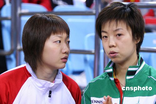 12月15日,“好運北京”大眾汽車2007國際乒聯(lián)職業(yè)巡回賽總決賽在北京大學(xué)體育館繼續(xù)進(jìn)行,在一場女單1/4決賽中,張怡寧以4-0(11-6,11-4,11-5,11-6)擊敗新加坡一姐李佳薇,輕松挺進(jìn)四強。張怡寧與李佳薇有過多次交戰(zhàn),加上兩人都曾在北京隊學(xué)習(xí)訓(xùn)練,因此都十分了解對手。圖為比賽前兩人在場下交流。中新社發(fā) 富田 攝