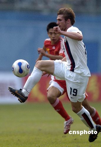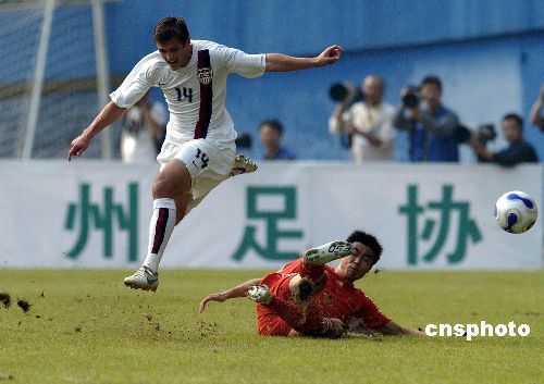 2007年12月16日下午,中國國奧隊(duì)與美國國奧隊(duì)的第二場(chǎng)友誼賽在廣州越秀山體育場(chǎng)鳴哨。在上半場(chǎng)比賽中,大幅調(diào)整陣容的中國國奧隊(duì)完全被對(duì)手壓制,美國隊(duì)由羅杰斯、蘭尼和達(dá)維斯各入一球,早早以3比0領(lǐng)先。國奧隊(duì)主帥杜伊在下半場(chǎng)頻繁換將,國奧小將們展開反撲,朱挺、杜震宇相繼送出精彩入球,最終比分為3比3。補(bǔ)時(shí)階段王曉龍不理智的犯規(guī)引發(fā)雙方?jīng)_突,其與克里斯坦雙雙被罰下。中新社發(fā) 吳峻 攝