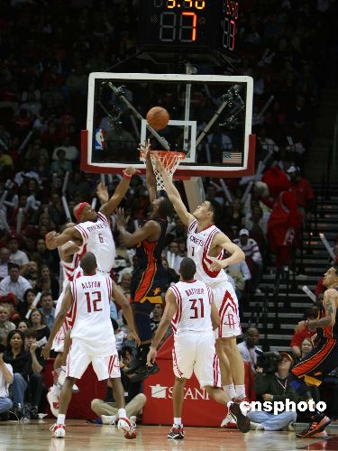 休斯頓火箭隊三十一日晚在主場豐田體育中心以九十五比一百一十二負于來訪的金州勇士隊。姚明在比賽中僅有八次出手,得到了十六分。阿爾斯通拿下火箭隊當晚最高的二十二分。圖為當日的比賽。中新社發 楊晉生 攝