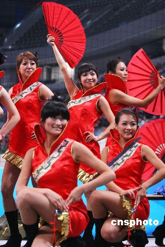 1月11日,“好運北京”2008手球邀請賽在國家體育館落幕。圖為啦啦隊隊員活力四射的勁舞,為比賽添色不少。中新社發 富田 攝