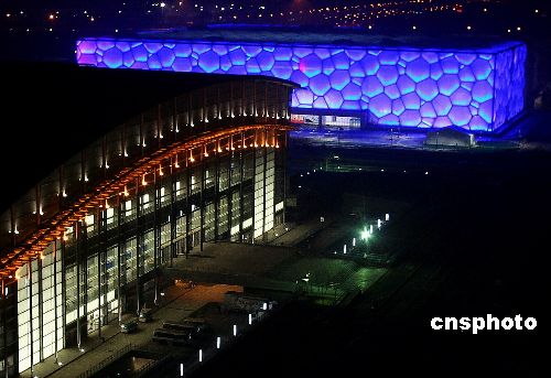 1月21日,北京奧林匹克公園內的北京奧運會游泳館-水立方進行夜景燈光調試,迎接1月31日在這里舉行的“好運北京”中國游泳公開賽。中新社發 富田 攝