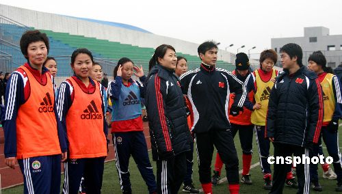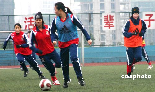 2月9日,中國女子足球隊的教練員、隊醫(yī)、管理、新聞官、理療師、裝備經(jīng)理、運動員等40多名人員分別從北京、沈陽、成都等地飛抵重慶后,陸續(xù)到達(dá)2008東亞女足錦標(biāo)賽的比賽地——永川區(qū)。當(dāng)日下午4時,韓端、徐媛、李潔等先期到永川的19名運動員在主教練伊麗莎白的帶領(lǐng)下,來到重慶文理學(xué)院足球場進行常規(guī)訓(xùn)練。中新社發(fā) 陳仕川 攝