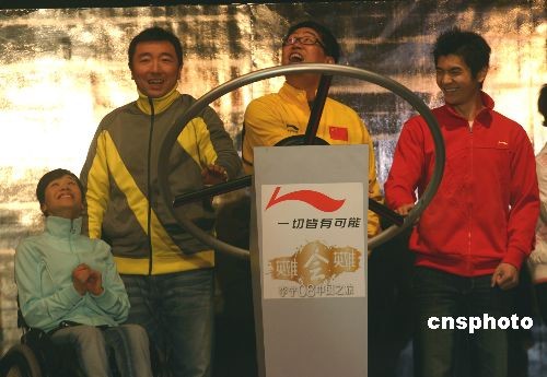 3月22日,“李寧零八中國之旅”活動在北京朝陽公園啟動,該活動將通過“大篷車”巡游的形式,歷時9個月,行程4萬公里,途經全國近百座中型城市宣傳奧運精神、大屏幕直播北京奧運會比賽,并開展三加一籃球挑戰賽等一系列全民健身活動。 圖為前中國體操隊選手桑蘭(左一)、奧運冠軍楊凌(左二)、邢傲偉(左四)等在啟動儀式上。中新社發 沈晨 攝