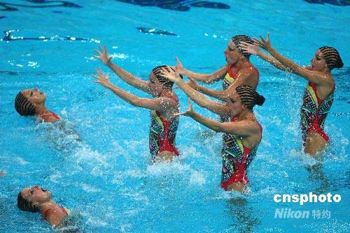 4月19日,“好運(yùn)北京”花樣游泳奧運(yùn)資格賽產(chǎn)生集體項(xiàng)目的金牌。西班隊(duì)以98.167分獲得冠軍,日本隊(duì)以96.501分獲得亞軍,加拿大名列第三,成績?yōu)?5.334分。根據(jù)國際泳聯(lián)規(guī)則,前三名獲得者獲得了最后三張奧運(yùn)集體項(xiàng)目的入場券,每支代表隊(duì)也附帶獲得了一個(gè)雙人項(xiàng)目參賽資格。 圖為西班牙隊(duì)在比賽中。作者: 富田