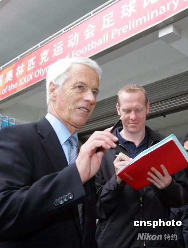 4月22日,國(guó)際足聯(lián)考察團(tuán)一行在北京奧組委官員的陪同下抵達(dá)上海,對(duì)08奧運(yùn)足球上海賽區(qū)籌備工作進(jìn)行考察。圖為國(guó)際足聯(lián)競(jìng)賽部官員瓦特·西伯(左)和約翰·舒馬赫在上海考察奧運(yùn)足球賽場(chǎng)。中新社發(fā) 湯彥俊 攝