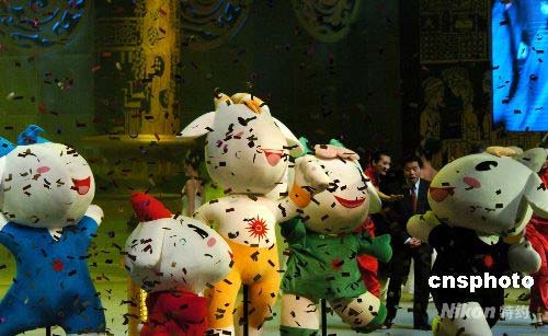 二十八日晚,廣州亞運會吉祥物在白云國際會展中心發布。吉祥物取名“樂羊羊”,形象是運動時尚的五只羊,分別取名“阿祥”、“阿和”、“阿如”、“阿意”、“樂羊羊”,組成“祥和如意樂洋洋”,表達了廣州亞運會將給亞洲人民帶來“吉祥、和諧、幸福、圓滿和快樂”的美好祝愿,同時也傳達該屆運動會“和諧、激情”的理念。中新社發 柯小軍 攝