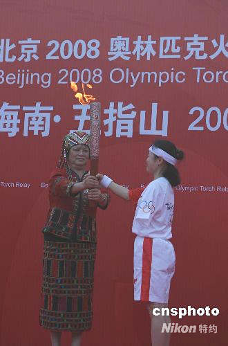 5月5日早上7時5分,北京奧運圣火在海南省腹地五指山市傳遞,五指山市是海南省黎、苗族聚居區域。圖為第一棒火炬手第十二屆殘奧會冠軍黎玉強(右)從海南省人大常委會副主任符桂花手中接過奧運火炬。中新社發 尹海明 攝
