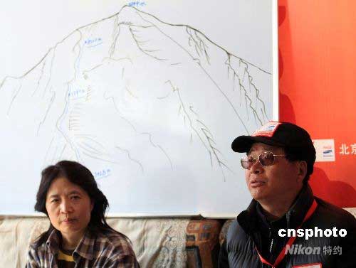 5月7日,在經歷了一場大雪后,珠峰地區已經連續3天晴好。中國登山隊發言人張志堅(右)在珠峰大本營絨布新聞中心詳解了登珠峰路線圖,并指出沿途有三大難點。他還指出,對這個路線,可以說是“輕車熟路,但是有一定困難”。中新社發 盛佳鵬 攝
