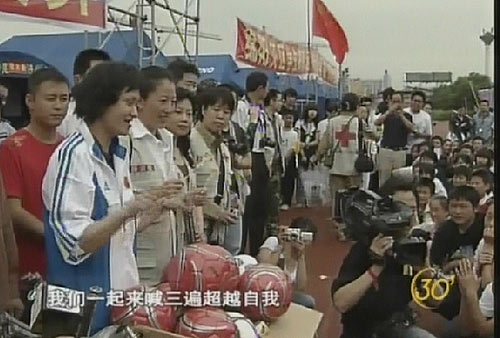 為了讓地震幸存者的心理創(chuàng)傷早日愈合,一支由奧運冠軍組成的特別的心理救援團抵達四川災(zāi)區(qū)為當?shù)厥転?zāi)民眾帶去心靈的寬慰。圖為在四川綿陽受災(zāi)群眾安置點,奧運冠軍高敏、楊揚帶著孩子們高呼“超越自我”。