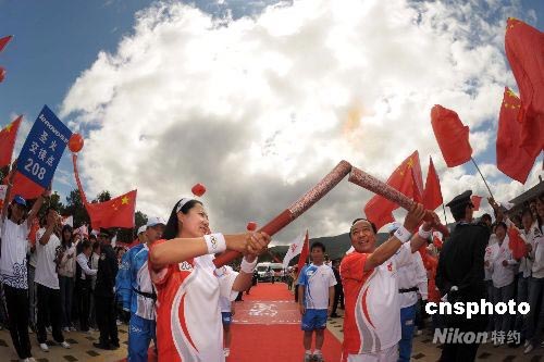 6月10日11時,奧運圣火麗江傳遞的207棒火炬手和自榮與最后一棒火炬手楊一奔(左)交接火炬,天空中的白云映襯著祥云圣火。隨后楊一奔在玉龍山腳下點燃圣火盆,奧運圣火傳遞麗江站圓滿結束。 中新社發 廖攀 攝