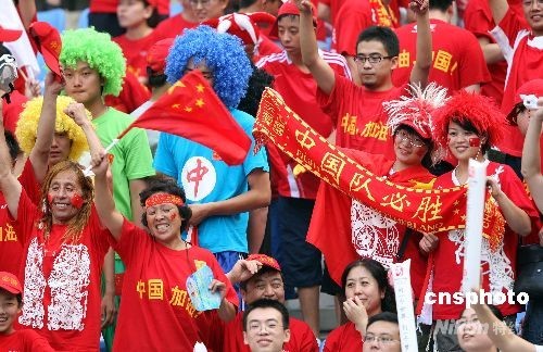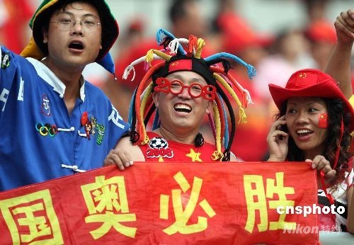 8月7日,北京奧運會沈陽足球分賽場男足預賽,中國隊1:1戰平新西蘭隊。圖為現場狂熱的中國球迷。中新社發 張宇 攝
