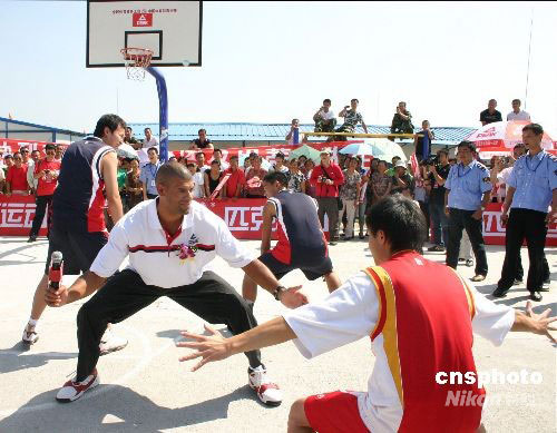 9月1日上午,參加“08中國愛心之旅”的NBA火箭隊球星巴蒂爾,來到四川地震極重災區都江堰市勤儉人家災民安置點慰問災區民眾。中新社發 霍潺 攝