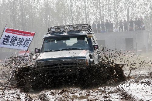 10月17日,2008華東地區汽車場地越野邀請賽決賽在安徽淮北市舉行。比賽分為男子、女子兩個組別,賽場設計了包括炮彈坑、深水池、蹺蹺板、沼澤地等18個障礙,來自華東地區百余頂尖車手、近60輛賽車齊聚淮北,各施絕技。中新社發 萬善朝 攝