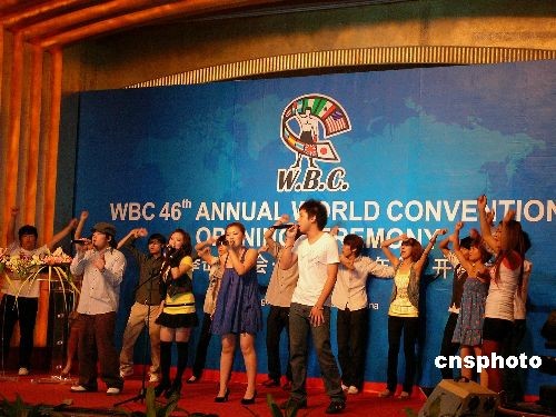 11月3日上午,2008世界拳擊理事會(WBC)第46屆年會在成都錦江賓館開幕,來自35個國家和地區的300多名拳擊界人士與會。年會除探討有關WBC的工作和未來規劃外,與會人士還將到都江堰地震災區參加“向勇敢者致敬”的活動。中新社發 楊杰 攝