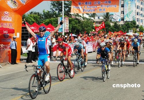 11月12日,2008環海南島國際公路自行車賽進行第一賽段三亞至興隆的比賽,經過163.6公里的激烈競爭,來自俄羅斯國家隊的112號車手伯瑞斯·斯皮爾斯基獲得賽段冠軍。圖為他沖過終點時慶祝勝利。中新社發 尹海明 攝
