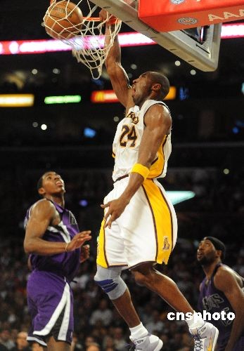 當(dāng)?shù)貢r間十一月二十三日晚,NBA洛杉磯湖人隊在主場迎戰(zhàn)薩克拉門托國王隊。最終湖人隊以一百一十八比一百零八擊敗國王隊,迎來四連勝,國王遭遇兩連敗。科比此役得到二十四分和六次助攻。中新社發(fā) 張煒 攝