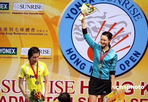 十一月三十日,中國香港選手王晨在香港公開羽毛球超級賽女單決賽中以二比一戰(zhàn)勝中國選手謝杏芳,奪得冠軍。中新社發(fā) 武仲林 攝