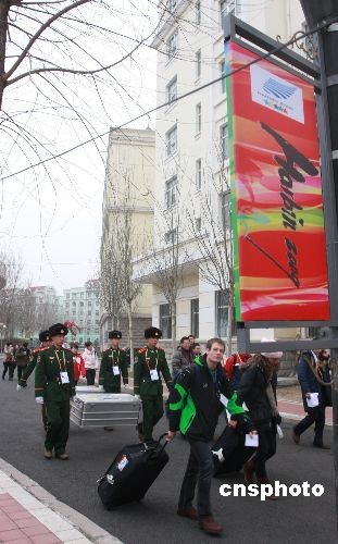 2月12日,黑龍江哈爾濱市,來此參加大冬會的德國代表團成員進入大冬會運動員村。當日,第24屆世界大學生冬季運動會黑龍江大學運動員村迎來首批客人。中新社發 王忠言 攝