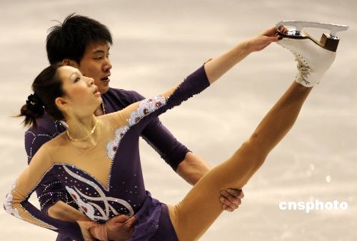 當(dāng)?shù)貢r(shí)間三月二十五日晚,在二00九年花樣滑冰世界錦標(biāo)賽雙人滑決賽中,中國(guó)選手張丹/張昊獲得亞軍。中新社發(fā) 張煒 攝