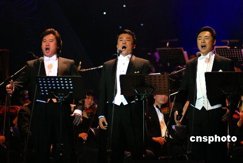 10月24日晚,華人三大男高音丁毅、范競馬、戴玉強在北京傾情高歌,由此,《我們的奧運》之“全球華人三大男高音”世界巡演音樂會正式啟動。當晚,三人除了演唱西洋經典歌劇選段《今夜無人入睡》、《重歸蘇蓮托》等外,還演唱了多首中國民歌和祝福奧運的《北京頌歌》。承辦方華視嘉禾介紹說,“三高”此次巡演是代表全球華人藝術家向北京2008年奧運會獻上的一份祝福,也是表達對不久前去世的世界著名男高音歌唱家帕瓦羅蒂的緬懷。不久前,丁毅、范競馬、戴玉強已通過工商局注冊為“華人·三高”的品牌。至此,中國聲樂界也有了“三高”。他們表示,“三高”的提法并非指“中國最頂尖的三大男高音”,而只是眾多優秀男高音之中具有代表性的三位。中新社發 李學仕 攝