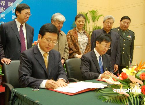 10月27日,由大連市人民政府申辦,經中國文聯、中國電影家協會考察決定,第17屆中國金雞百花電影節將于2008年9月在大連市舉行。圖為大連市代表和中國電影家協會代表簽約。中新社發 邱勇 攝