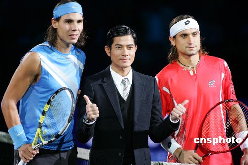 11月13日,香港藝人郭富城在上海“執法”網球大師杯,為西班牙“德比”——拉斐爾·納達爾與大衛·費雷兒的比賽“挑邊”。圖為郭富城(圖中)與納達爾(圖左)費雷兒(圖右)在賽場合影。中新社發 湯彥俊 攝